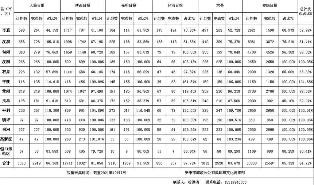 截至2021年12月7日,全市重點黨報黨刊完成量占下達計劃數(shù)的84.72%。征訂情況為:寧陜縣104.85%,平利縣103.51%,高新區(qū)100.86%,鎮(zhèn)坪縣100.06%,漢陰縣100.05%,白河縣100.05%,紫陽縣99.36%,旬陽市88.06%,漢濱區(qū)81.41%,恒口示范區(qū)80.41%,嵐皋縣62.97%,市直各單位52.99%。其中,寧陜縣、平利縣、高新區(qū)、鎮(zhèn)坪縣、漢陰縣、白河縣,措施有力,率先完成2022年度征訂任務(wù)。