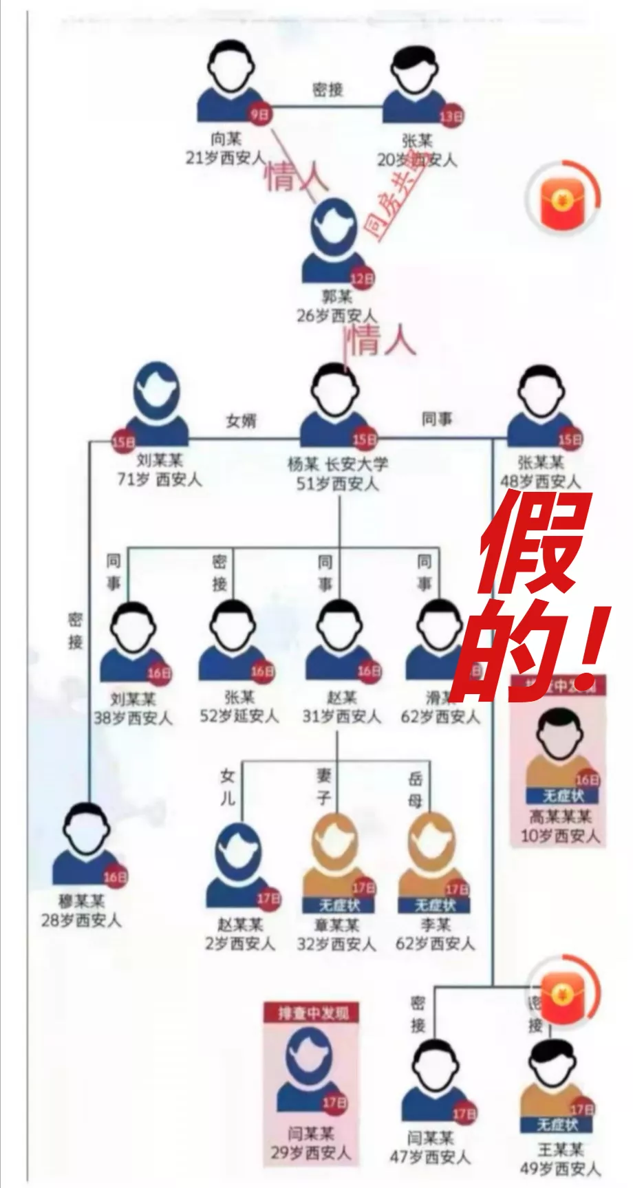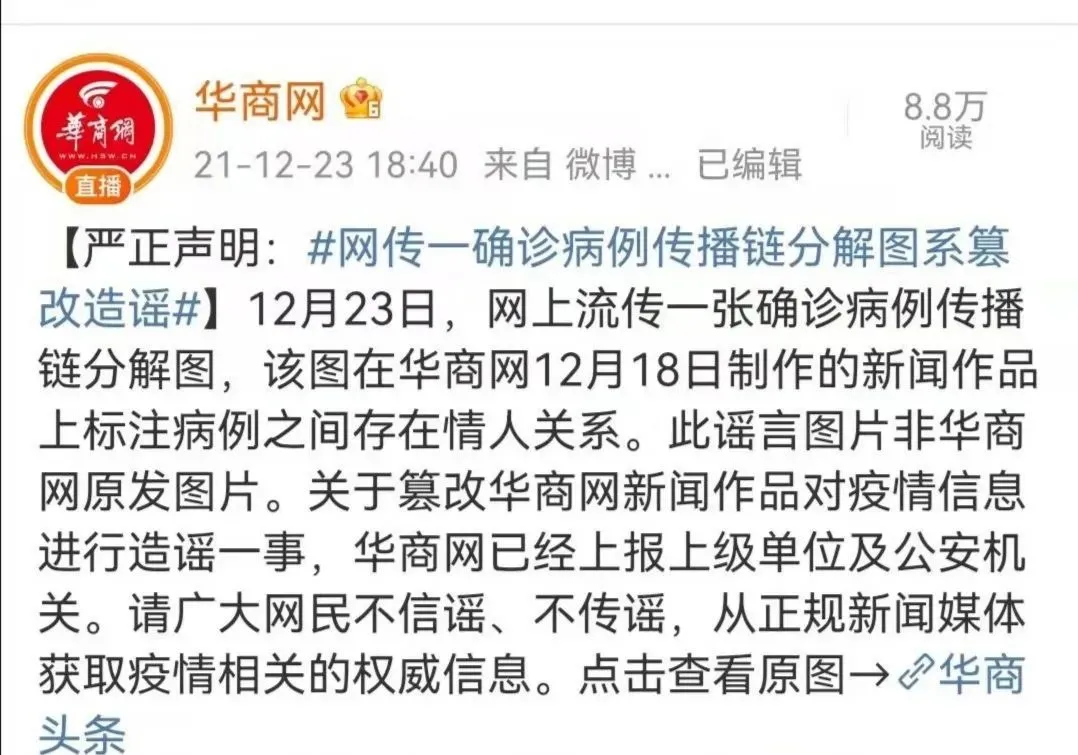 網(wǎng)上流傳一張確認病例傳播鏈分解圖,在病例之間標注“情人”關(guān)系,并傳言此次疫情傳播因素之一,是因為西安首例病例與子牛門診的護士為情人關(guān)系,導(dǎo)致疫情擴散,經(jīng)核實,該圖盜用華商網(wǎng)12月18日制作的新聞作品圖片。該信息為虛假信息,造謠的人已被拘留。