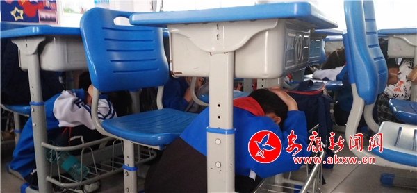演練分為室內(nèi)緊急避險(xiǎn)和應(yīng)急疏散兩個(gè)環(huán)節(jié)。上午9時(shí)許,隨著第一次地震防空警報(bào)聲急促響起,各班班主任立刻指導(dǎo)學(xué)生室內(nèi)防震技能,指揮學(xué)生迅速躲在各自課桌的旁邊,閉眼,蹲下身體擋住頭部。1分鐘后,再一次發(fā)出地震防空警報(bào)聲,在老師的引導(dǎo)下,各班有序秩地撤離,撤離全程不到三分鐘。