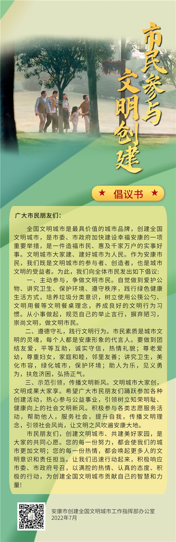 全國(guó)文明城市是最具價(jià)值的城市品牌,創(chuàng)建全國(guó)文明城市,是市委、市政府加快建設(shè)幸福安康的一項(xiàng)重要舉措,是一件造福市民、惠及千家萬(wàn)戶的實(shí)事好事。文明城市大家建、建好城市為人民。作為安康市民,我們既是文明城市的參與者、創(chuàng)造者,也是城市文明的受益者。為此,我們向全體市民發(fā)出如下倡議:??