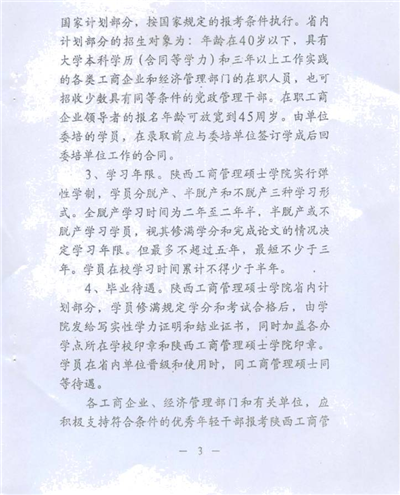按照省政府有關文件規(guī)定,學員修滿規(guī)定的課程學分,完成畢業(yè)論文,通過論文答辯及評審后,由陜西工商管理碩士學院頒發(fā)畢業(yè)證書和學力證明。學員在省內(nèi)單位晉級和使用時,視同工商管理碩士。