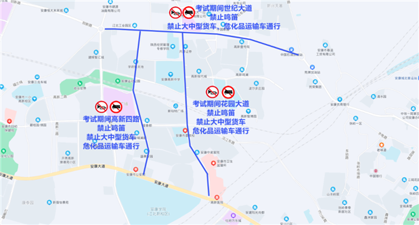 1、花園大道(安康大道至世紀(jì)大道)、世紀(jì)大道(新路口環(huán)島至五路口環(huán)島)、高新四路,所有通行車輛于6月6日21時(shí)至6月8日21時(shí),無(wú)論遇到何種情況,一律禁止鳴笛,禁止大中型貨車、?;愤\(yùn)輸車通行。