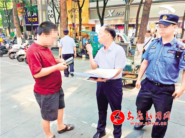 7月18日上午,漢濱城管執(zhí)法分局“‘痰’吐文雅,舉‘紙’得體”糾治組在金州路、白天鵝廣場(chǎng)以及公交車(chē)站附近巡查值守,對(duì)取證發(fā)現(xiàn)的隨地吐痰不文明行為進(jìn)行法規(guī)宣傳教育,并采取罰款、微信朋友圈發(fā)公益廣告集贊等形式給予糾治。李東 攝