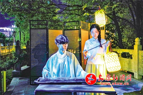 還未走近安瀾樓,就被一首琵琶曲改編的絲竹樂曲《春江花月夜》吸引,流暢多變的節(jié)奏,巧妙細膩的配器,絲絲入扣的演奏,仿佛將觀眾帶入那個月夜春江的迷人景色。環(huán)繞安瀾樓四周,畫家楊炳昌筆下的金州八景,仿佛一秒穿越古今,勝景徐徐、浮現(xiàn)腦際。