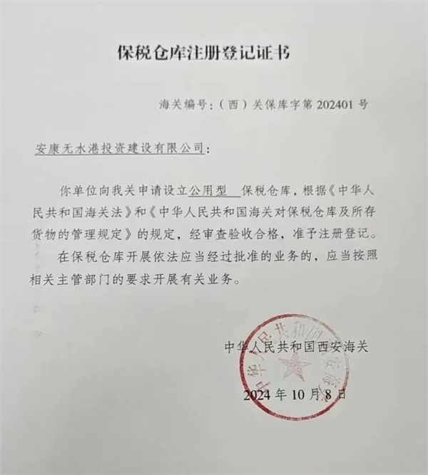 10月8日,由恒口示范區(qū)申請?jiān)O(shè)立的“公用型保稅倉庫”正式通過海關(guān)審查驗(yàn)收,成功獲得由西安海關(guān)頒發(fā)的《保稅倉庫注冊登記證書》,標(biāo)志著該保稅倉已具備正式運(yùn)營資質(zhì)和能力,可正式對外開展實(shí)際業(yè)務(wù)。
