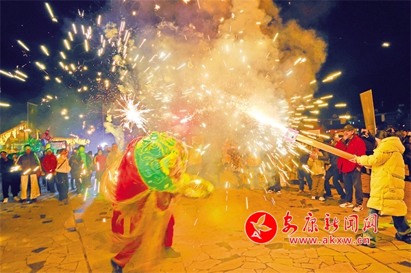 夜幕降臨,在中壩作坊小鎮(zhèn)廣場上,音樂響起,熊熊篝火燃燒,伴隨著動感的音樂,游客與居民們手牽手,肩并肩,圍著篝火載歌載舞。而最吸引人的還是舞火龍、火獅子表演,在璀璨煙火中,火龍飛舞盤旋,火獅子搖頭晃腦,騰挪跳躍,威風(fēng)八面,現(xiàn)場不少游客噴起煙花,花燒得越旺、鑼鼓聲越急,獅子舞得也越歡快,大家共同享受著這場精彩紛呈的非遺文化盛宴。