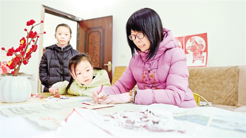 馮增慧教兩個(gè)孫女學(xué)剪紙 羅妍 攝?