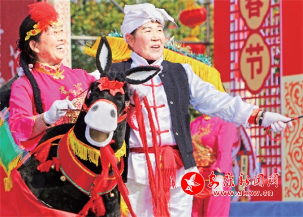 2月10日,民間藝人在金州廣場表演社火《毛驢迎新春》。趙華斌 攝