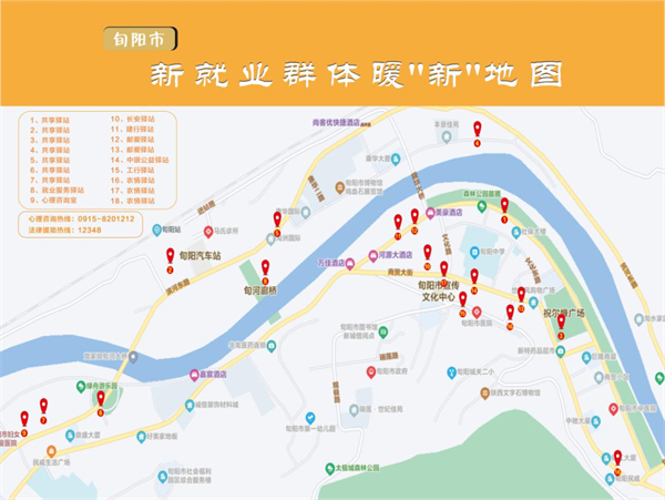 為提升服務(wù)效能,讓更多新就業(yè)群體享受到便捷的暖新服務(wù),旬陽(yáng)市委社會(huì)工作部特別制作了暖“新”地圖,將城區(qū)18處共享驛站具體位置精準(zhǔn)標(biāo)注在地圖上,可一目了然找到距離最近的驛站。此外,暖“新”地圖還提供了旬陽(yáng)心理咨詢熱線和“12348”法律援助熱線,全方位服務(wù)新就業(yè)群體。?