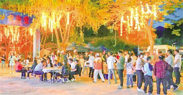 活動(dòng)現(xiàn)場(chǎng),本土樂(lè)隊(duì)、游客與特邀嘉賓輪番登臺(tái),民謠、搖滾、電子樂(lè)交織回蕩。游客們圍著篝火載歌載舞,火光映紅張張笑臉。現(xiàn)場(chǎng)設(shè)置的文創(chuàng)產(chǎn)品和小龍蝦、燒烤等特色美食攤位更是滿足了游客的多重體驗(yàn)。