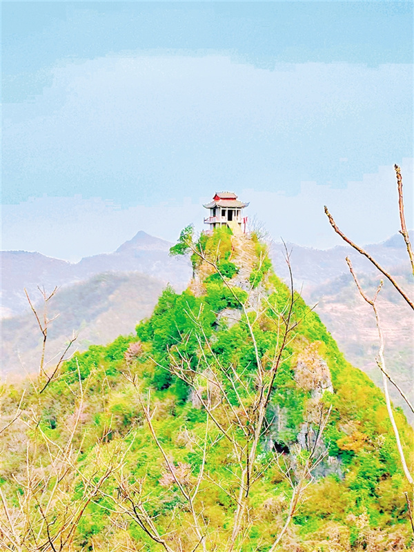 峭壁之上,是一座正在修建的觀景臺(tái),亭子雖不大,但是飛檐翹角,白墻黛瓦,矗立在山頂,也顯得頗為偉岸。站在觀景臺(tái)上俯瞰山谷,任山風(fēng)拂面,頓覺神清氣爽,油然而生一種“一覽眾山小”的自豪。