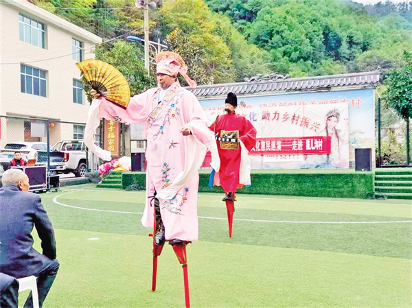 在五峰村,村支部書記羅仁春告訴記者,2023年村委會牽頭成立了五峰村文化民俗文藝協(xié)會,陸續(xù)加入的48名會員涵蓋老中青三代,既有傳承高蹺絕技的老人,也有主動(dòng)學(xué)習(xí)弦子腔的年青一代。今年32歲的村民小梅加入?yún)f(xié)會后,一改往日下班后悶在家中的狀態(tài),每天下午吃完飯都會下樓和新認(rèn)識的姐妹載歌載舞,很快就成為舞蹈隊(duì)的主力。“以前不知道我們村上還有文藝協(xié)會,自從村上干部告訴我后,我就趕緊加入了這個(gè)小團(tuán)體,既鍛煉了身體,又愉悅了心情,生活幸福感越來越強(qiáng)烈?!鄙碇璧阜男∶飞碜随鼓?,水袖飛揚(yáng)間,明媚的笑容如花一樣燦爛。