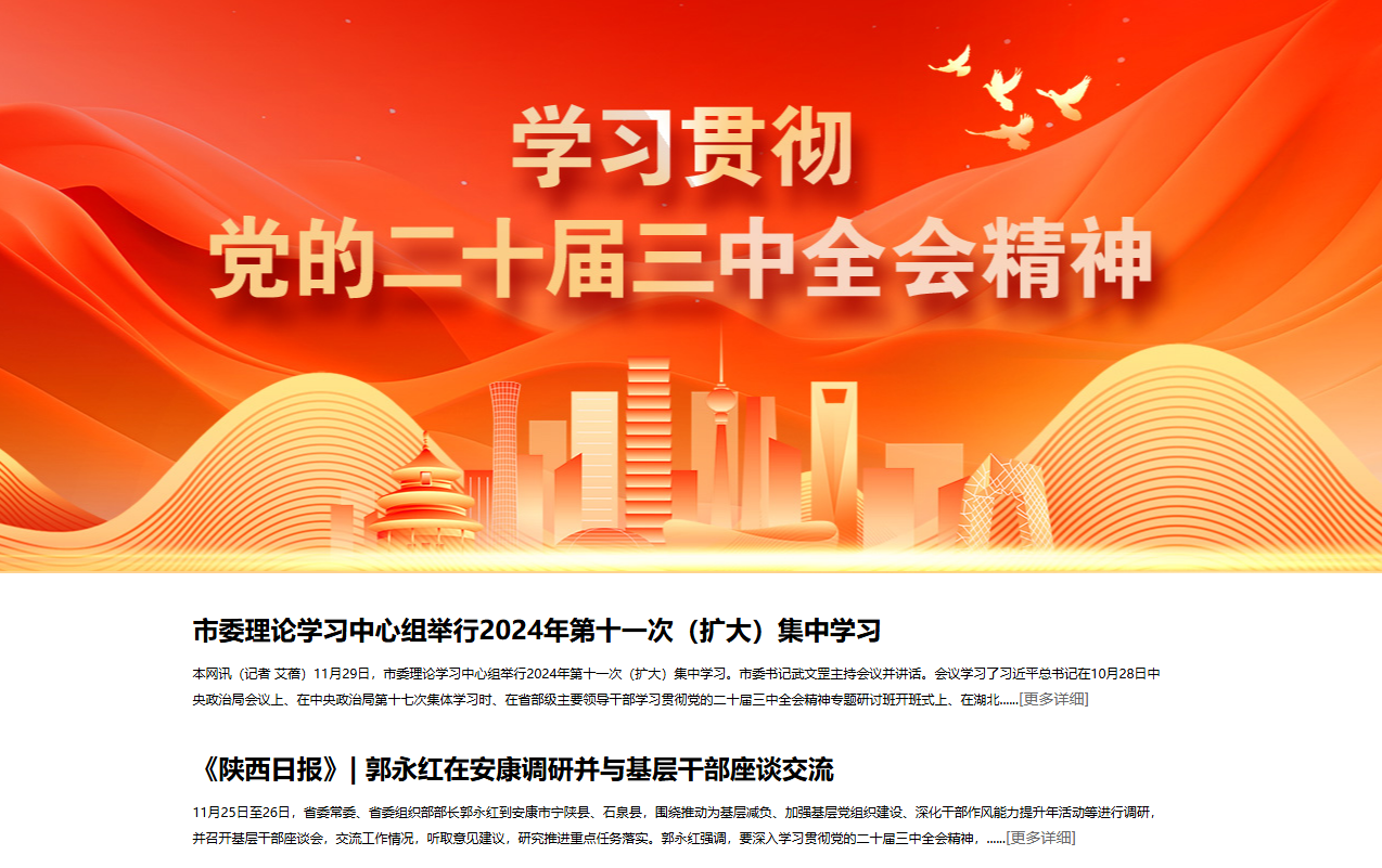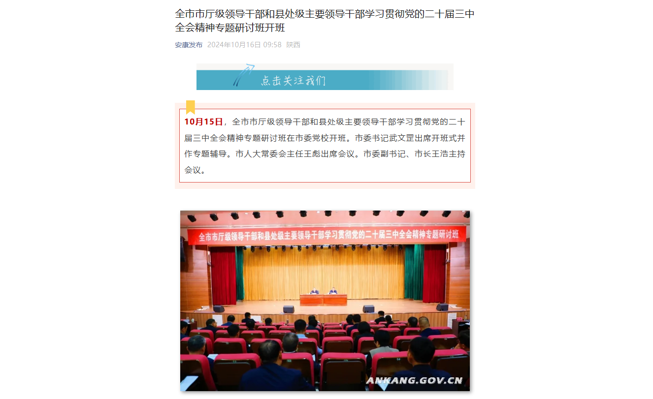 《全市市廳級(jí)領(lǐng)導(dǎo)干部和縣處級(jí)主要領(lǐng)導(dǎo)干部學(xué)習(xí)貫徹黨的二十屆三中全會(huì)精神專題研討班開(kāi)班》(2024-10-16發(fā)布于安康發(fā)布公眾號(hào))