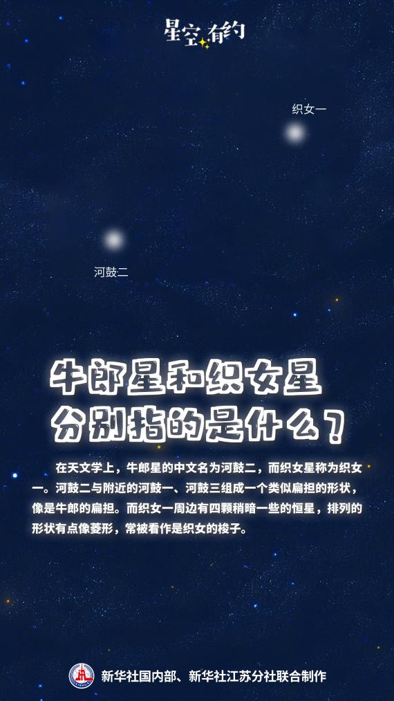 中國科學(xué)院紫金山天文臺(tái)科普主管王科超說,在天文學(xué)上,代表牛郎、織女的天體分別是牛郎星和織女星。牛郎星的中文名為河鼓二,織女星為織女一,它們分別是天鷹座和天琴座的亮星。河鼓二與附近的河鼓一、河鼓三組成一個(gè)類似扁擔(dān)的形狀,像是牛郎的扁擔(dān)。而織女一周邊有四顆稍暗一些的恒星,排列的形狀有點(diǎn)像菱形,常被看作是織女的梭子。