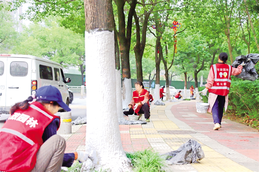 “刷白不是簡(jiǎn)單的涂涂畫畫,得兼顧效果與顏值?!爆F(xiàn)場(chǎng)管護(hù)負(fù)責(zé)人周宏安介紹,作業(yè)中嚴(yán)格執(zhí)行統(tǒng)一標(biāo)準(zhǔn),采用涂白劑、石硫合劑、水按20∶1∶10配比的藥劑,在每棵樹上標(biāo)定基準(zhǔn)線,確保涂白高度控制在1米至1.2米之間,做到上口平齊、下不露“腳”。針對(duì)樹皮縫隙、孔洞等關(guān)鍵部位,工人們反復(fù)涂刷,同時(shí)全程做好防護(hù),避免藥劑外濺污染路面與樹穴,實(shí)現(xiàn)“防護(hù)到位、環(huán)境整潔”雙重目標(biāo)。