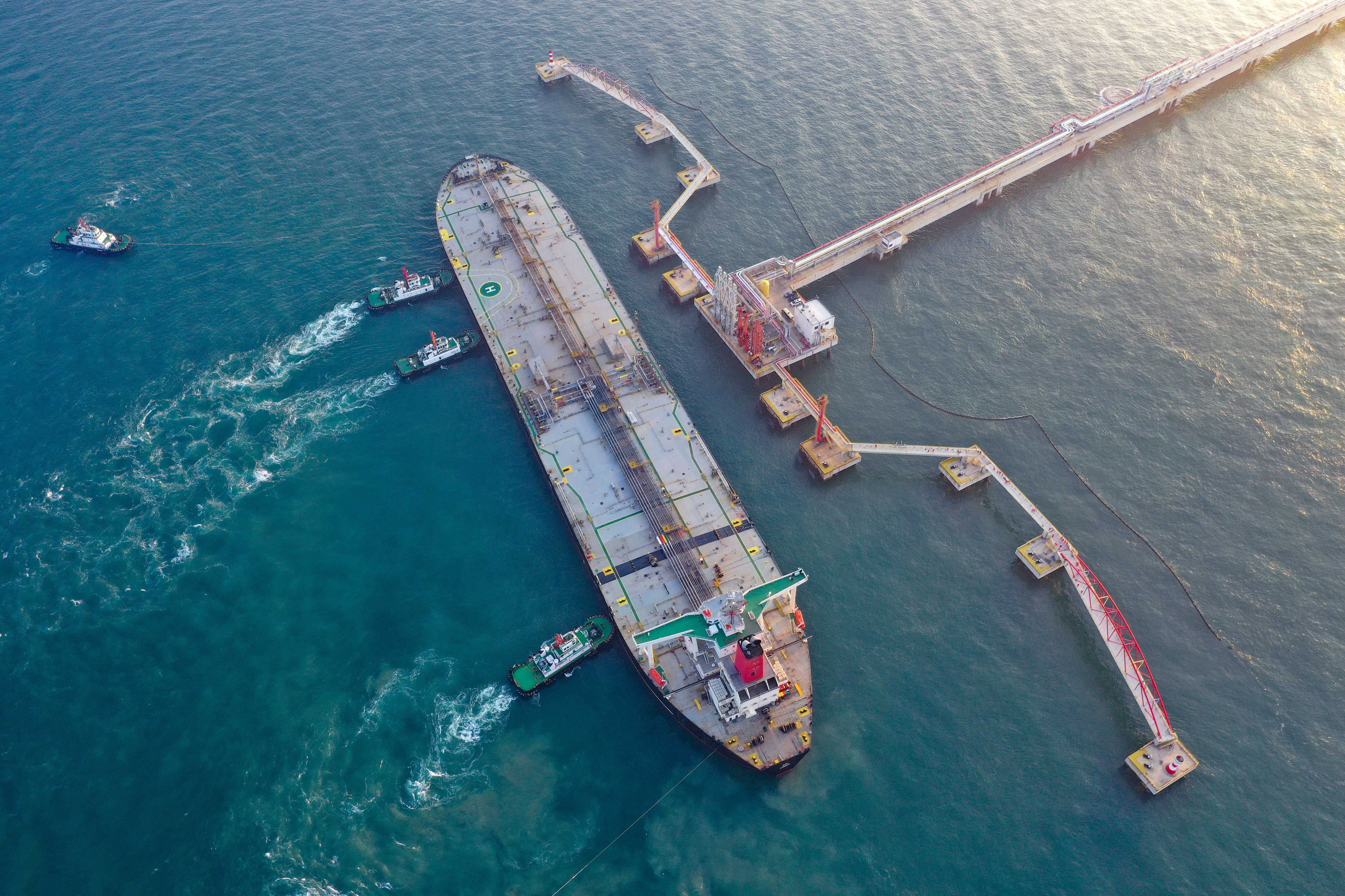 △ 2025年12月18日,一艘裝載著17.9萬(wàn)噸石化原輔料的船舶泊入位于海南省儋州市的國(guó)投洋浦油儲(chǔ)碼頭30萬(wàn)噸級(jí)原油泊位(無(wú)人機(jī)照片)。