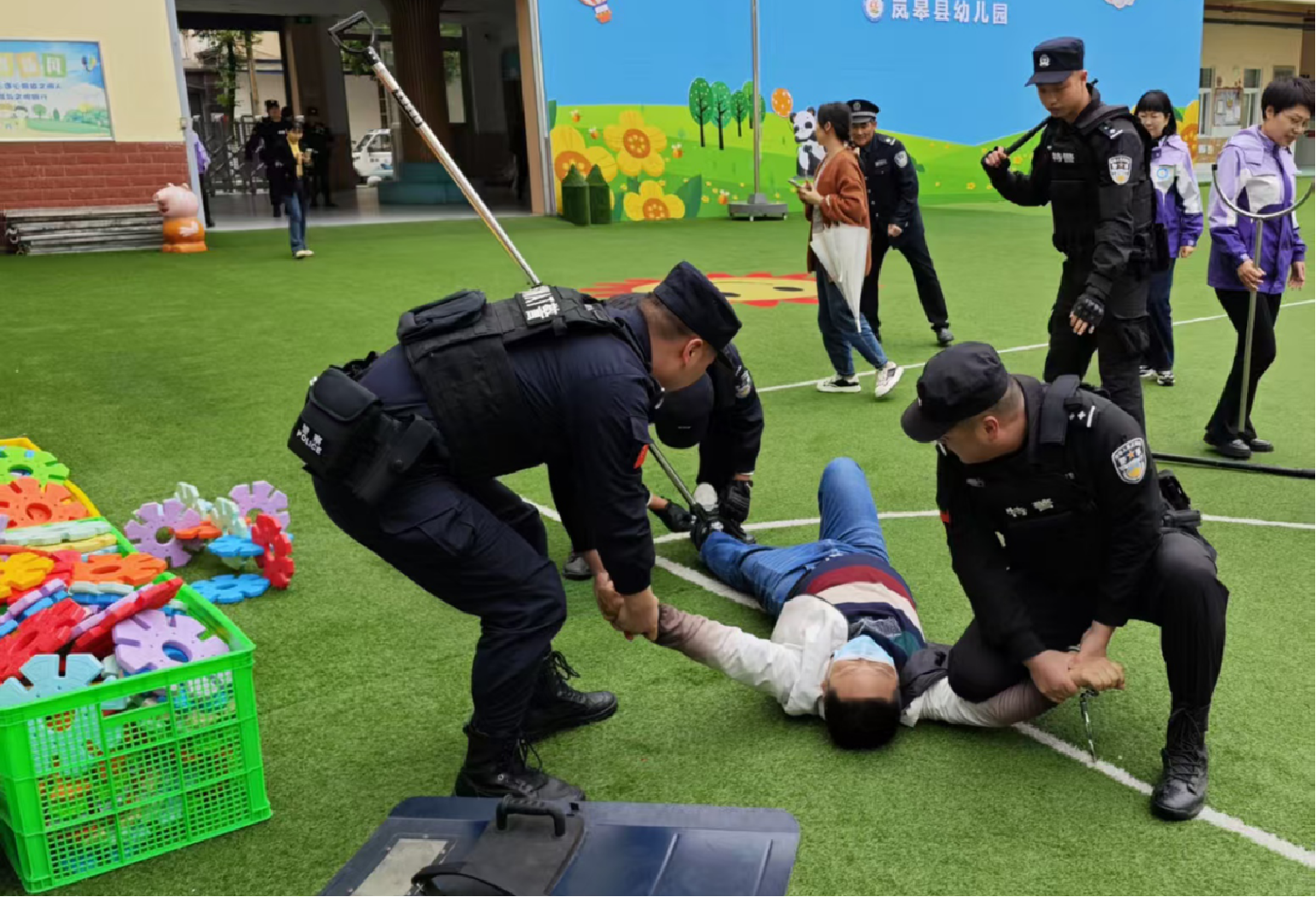△ 民警在幼兒園開展應(yīng)急演練