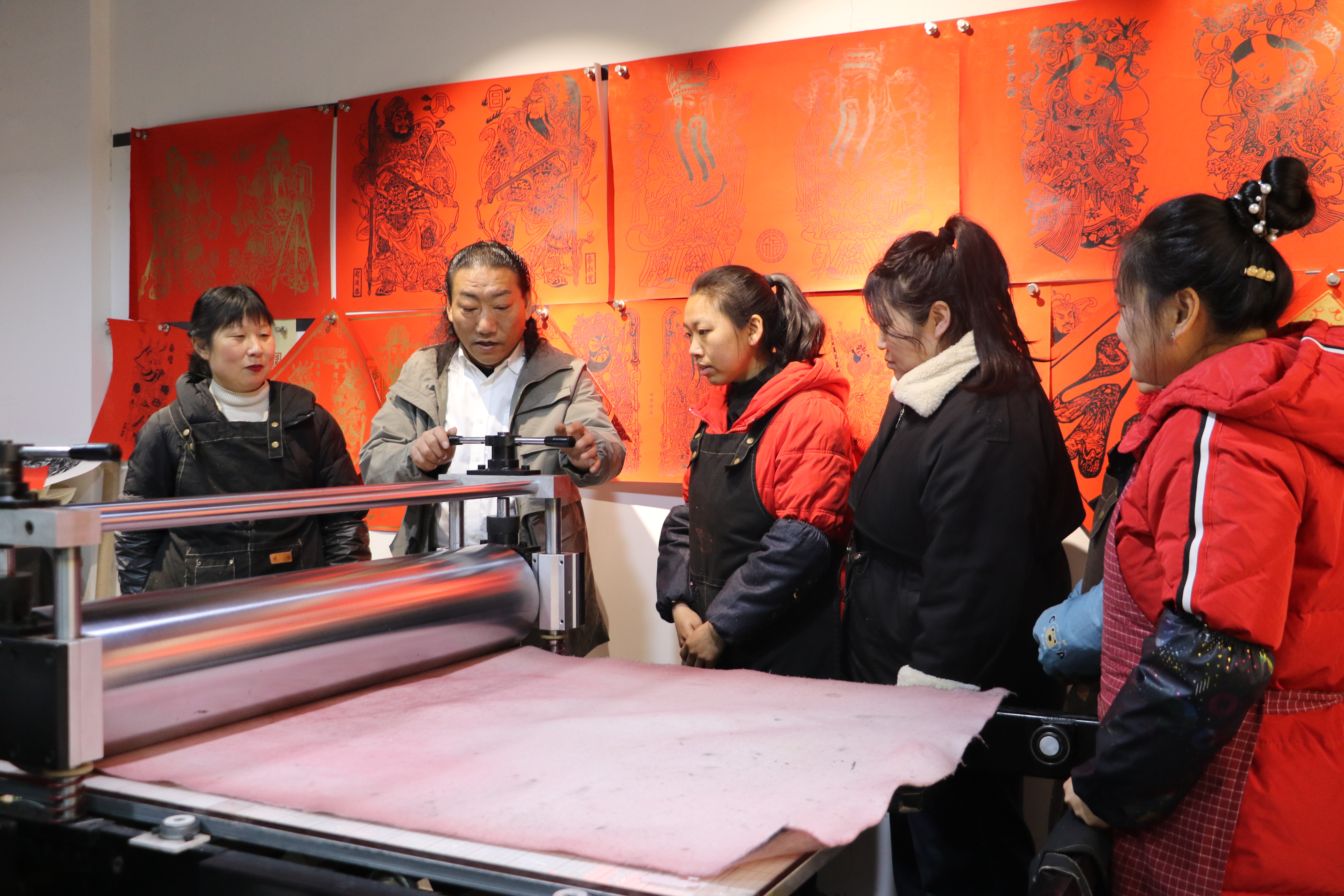 農(nóng)歷馬年春節(jié)前夕,在版畫(huà)院,一張張年畫(huà)整齊攤晾在貨架上,有明清紋樣的紅底金漆財(cái)神像,也有“馬上”成功的文創(chuàng)系列。雕版、刷色、拓印、攤晾、包裝、發(fā)貨……肖昌雙和姐妹們里里外外忙成一團(tuán)。